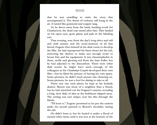 The Bayou is a queer southern gothic horror novella.